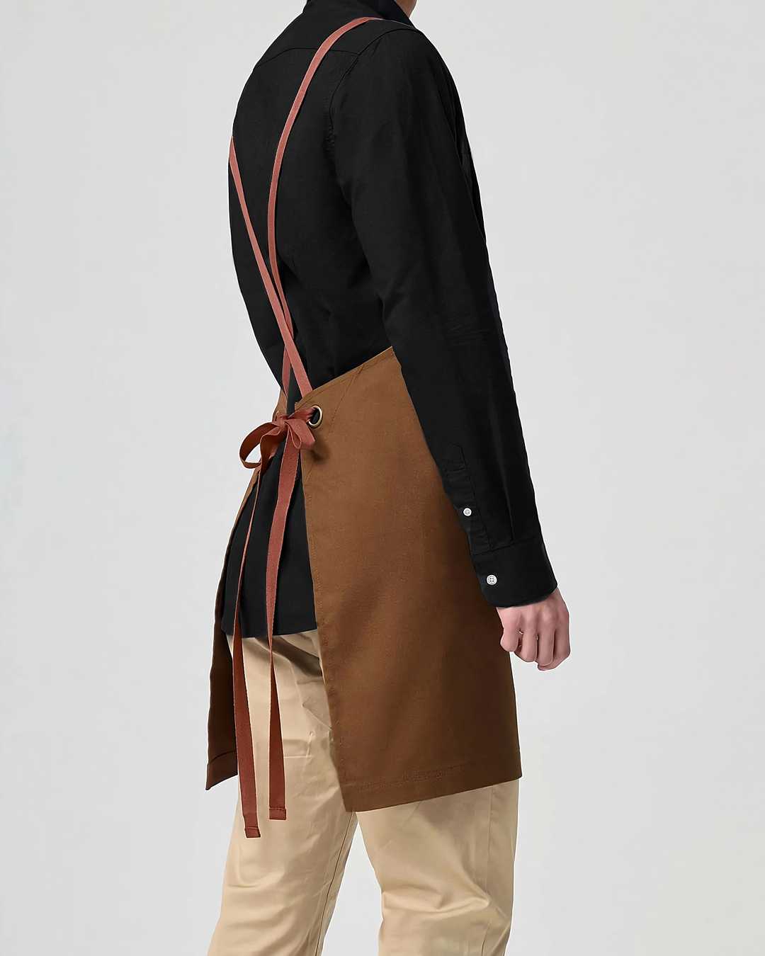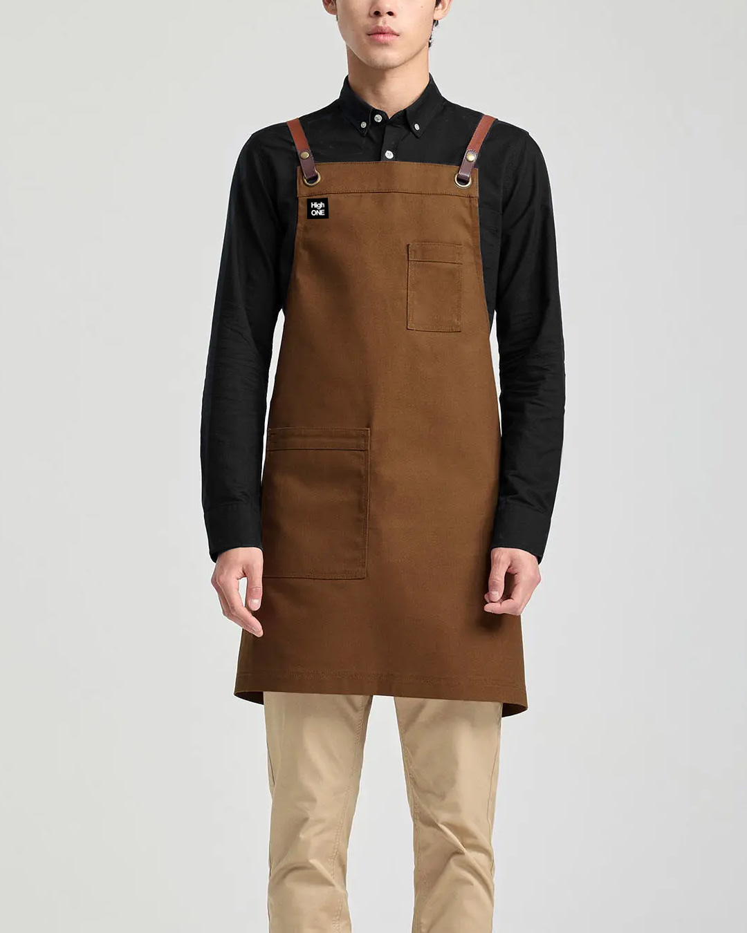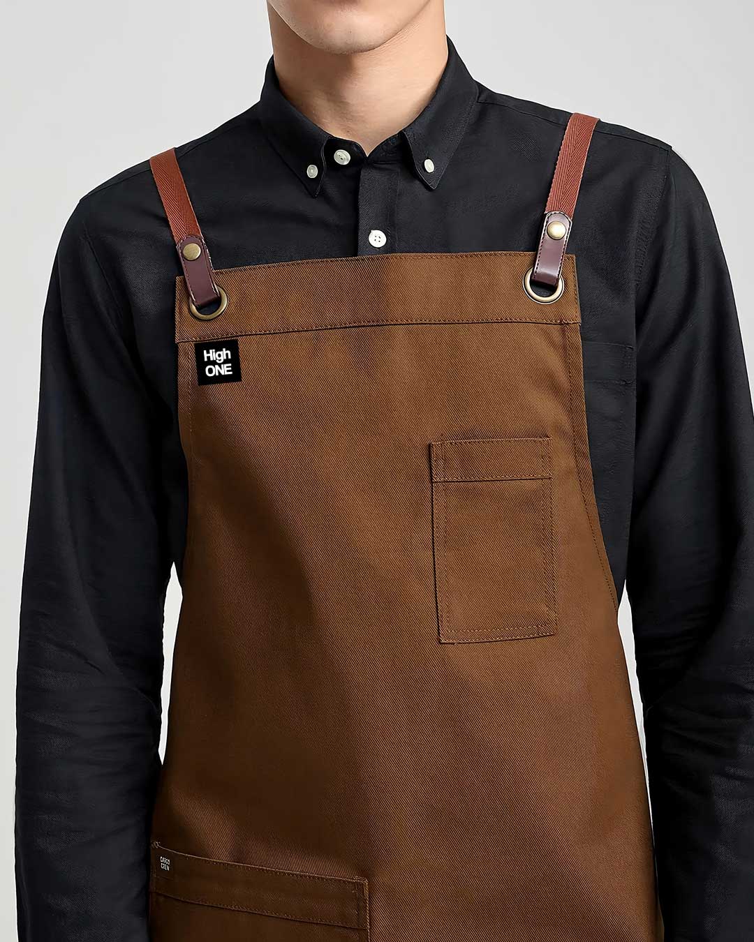 Confeccionado en drill nacional — Luce impecable, también resiste las exigencias del día a día. Un delantal muy cómodo con su sistema cruzado a la espalda, con una estética profesional y con 2 piezas de cuero que le aportan mucho estilo.